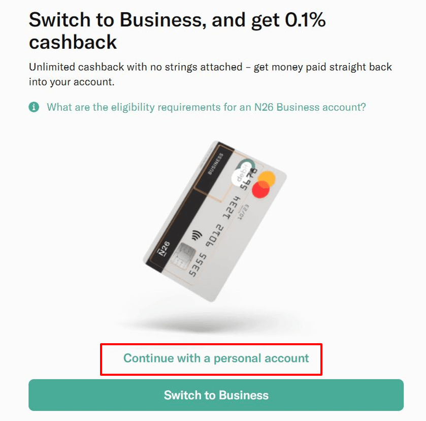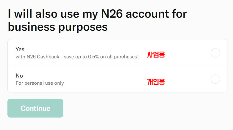 10. N26 은행 계좌가 사업용인지 개인용인지 선택합니다.