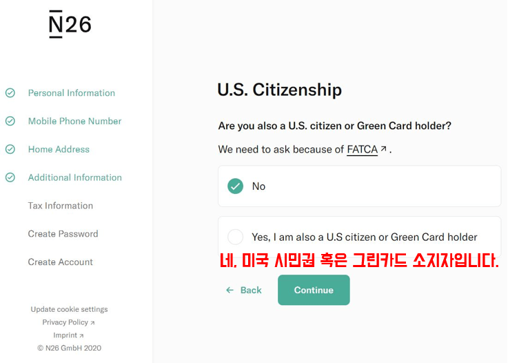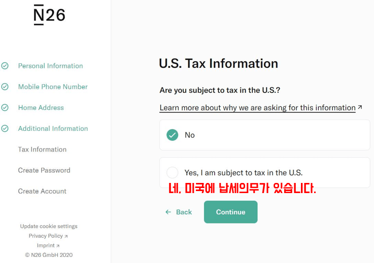 6. 미국 시민권 혹은 그린카드 소지자인지 미국에 납세의무가 있는지 고지합니다. 보통 해당사항이 없는 경우 '아니오/아니오'를 선택하시면 됩니다.