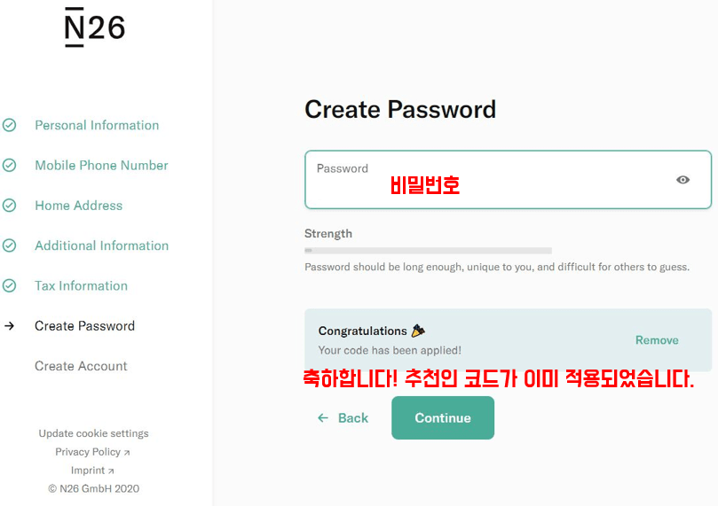 8. 은행 비밀번호를 설정합니다. 위의 추천인 링크를 통해서 가입을 진행 중이면 아래에 추천인 코드가 이미 적용되었다는 글이 보입니다. 혹시 아래의 메시지가 아니라 빈칸이 뜨면 추천인 코드eomjip8305를 입력합니다.
