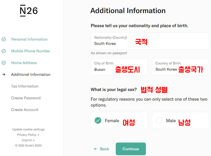 5. 국적, 출생도시, 출생 국가, 법적 성별을 기입합니다.