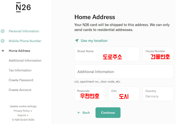 4. 카드를 받을 독일* 주소를 기입합니다. 거주지 등록이 된 곳이 아니라도 됩니다. 계속을 누르면 주소를 다시 한번 확인하는 창이 뜹니다. 확인 후 계속 진행합니다.